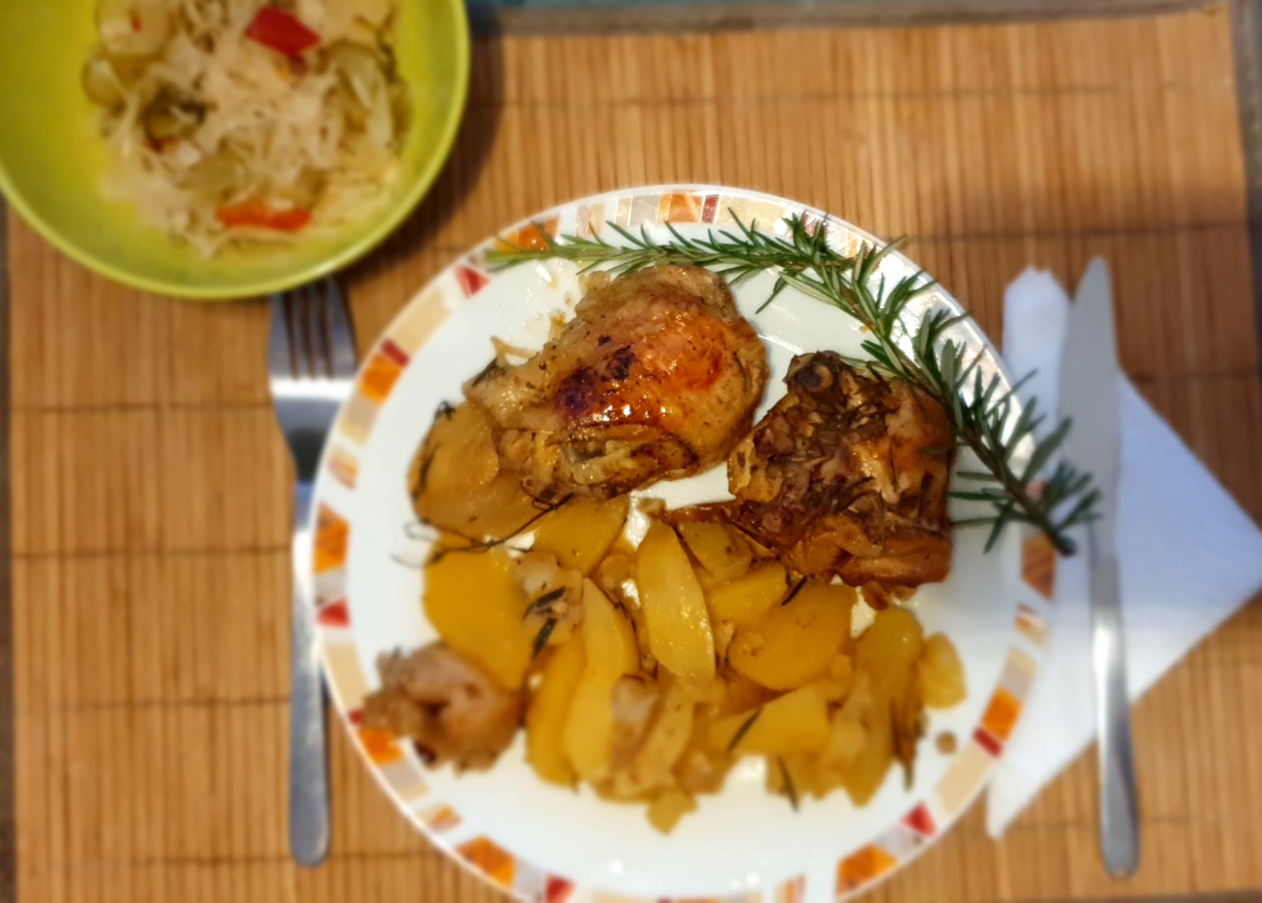 Hozzávalók: felső csirkecomb 10-12 db krumpli kb. 1 kg 1 nagy alma vöröshagyma 1 nagy fej fokhagyma 4-5 gerezd rozmaring kb. 4-5 kisebb ágacska kakukkfű kb. 4-5 friss szár só
